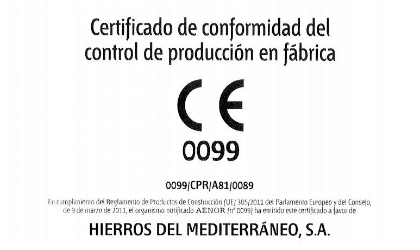 La obtención de dicha certificación permite a Hierros del Mediterráneo distribuir sus productos siderúrgicos con el Marcado CE., lo que asegura que toda producción puesta en el mercado lo hace conforme con las características de comportamiento declaradas.